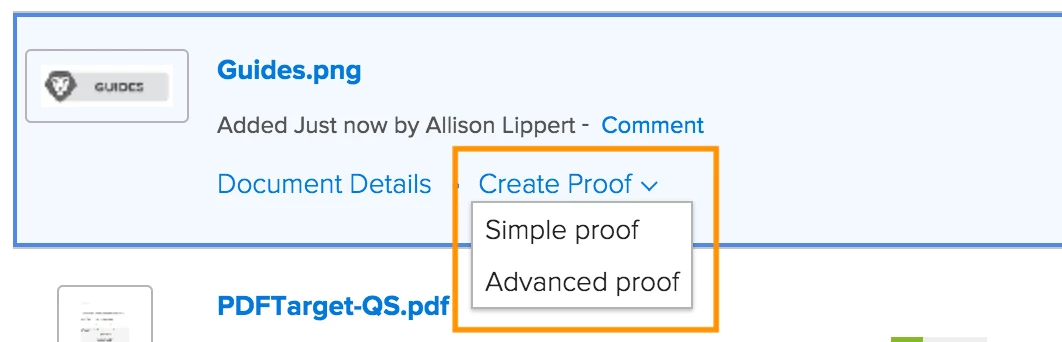 As you turn an existing document into a proof, select “Simple proof” just to generate the proof. Select “Advanced proof” to add a proofing workflow at the same time.