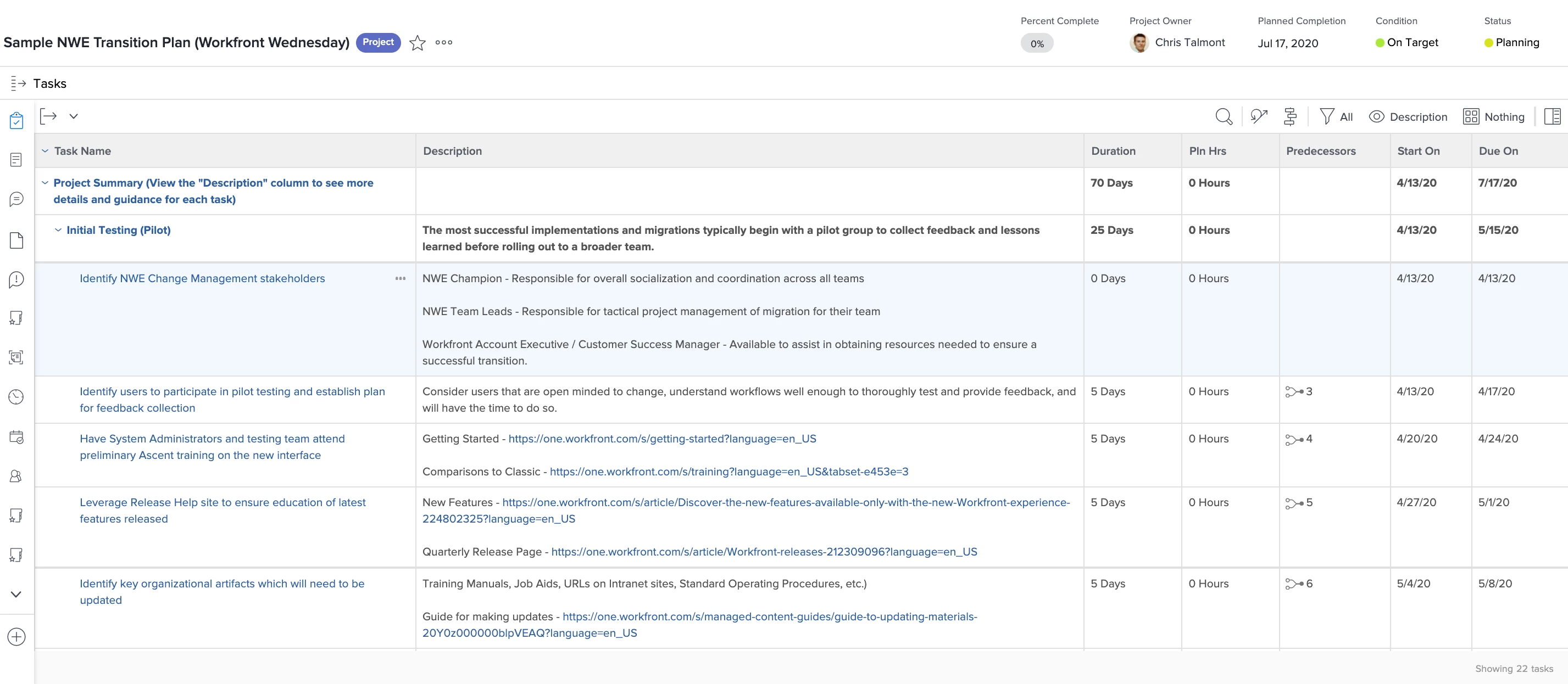 What better place to plan your transition than in Workfront itself. Chris Talmont, Workfront Customer Solutions Architect, developed a Workfront project plan that can be directly imported into the Projects area to help you manage the various steps of transition. The project template includes links to many useful resources and actionable steps or guidance along the way. Click here to automatically download a zip file with the MS Project .xml file included.