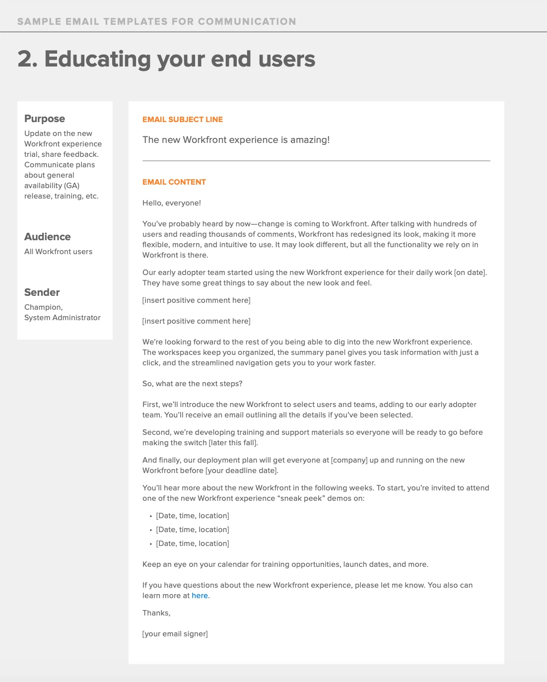 Communication is the key to helping people understand why the change will ultimately be beneficial to them and the organization. Communicating early and often instills confidence that they will be supported during the change and helps to address any outstanding questions to alleviate fears. The project plan referenced above contains links to the new Workfront experience Onboarding Guide which offers several communication templates (pages 19-23) to inform your teams at each stage of the transition. Use these to make sure everyone is well informed!