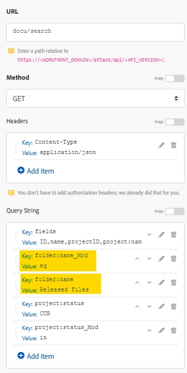 The files I need are all found across multiple folders, all with a standard name, (across multiple projects) so a search by folder name is possible. What I am stumped on is how to build the custom API call to account for the folder name when searching for documents.