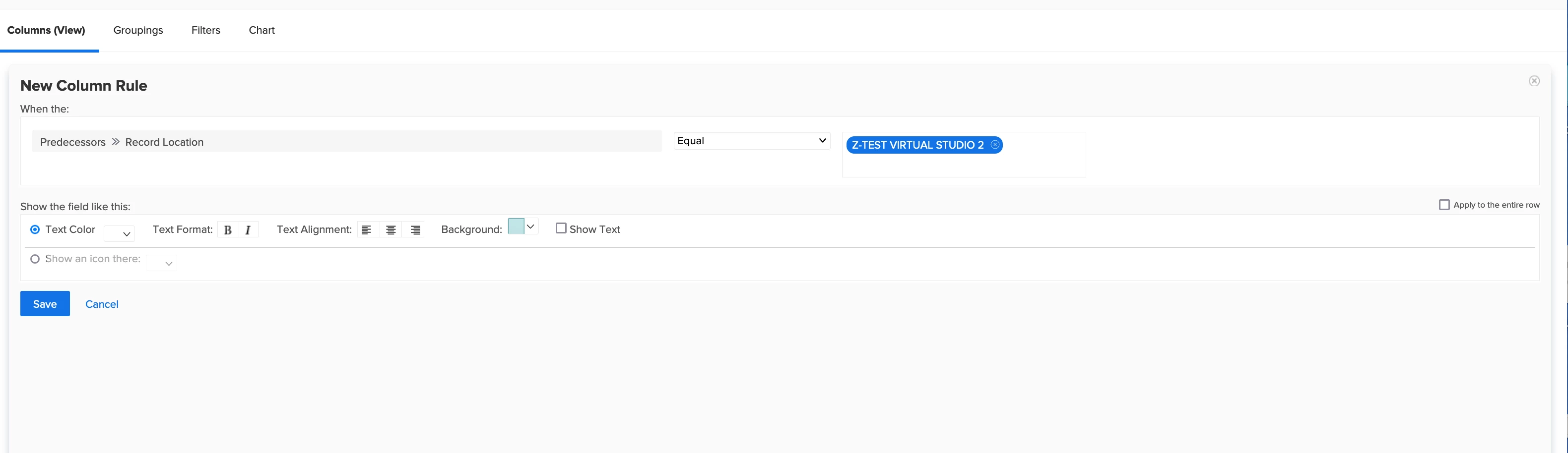 I aimed to add color to the column when the task's "Record location" is equal to A, B, or C, and also when the predecessor task's "Record location" is equal to A, B, or C. ( By using advanced option)
