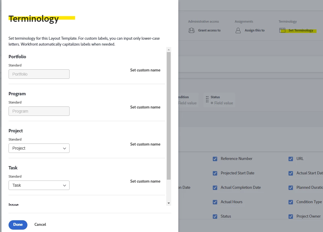 It sounds like they have custom terminology set up in their layout templates. There isn't a way to report on layout template properties, so I've created documentation for it. Something like this is simple enough. You could put this into a project in Workfront to capture the info and then report on it.
