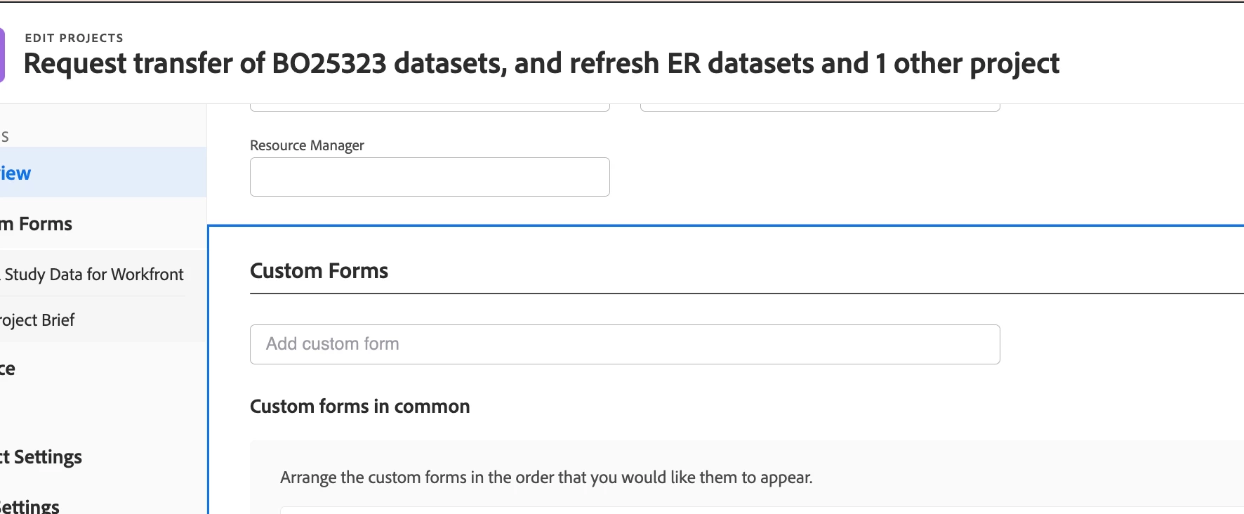Currently, users are able to select multiple projects and are able to Add a Custom Form to selected objects such as Projects with a single Save. (For example... see Add custom form field in screenshot).