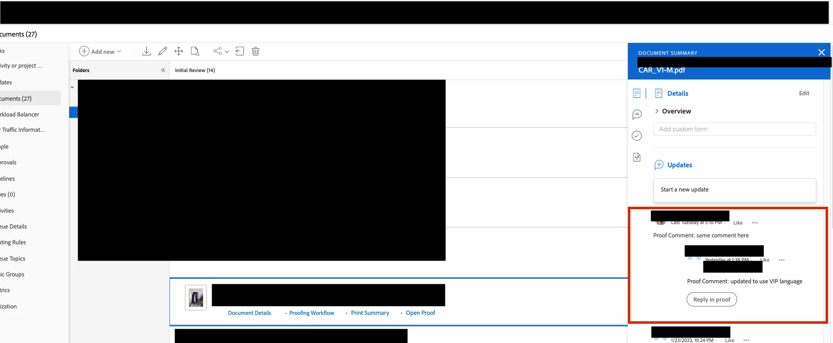 Current Behaviour - Does not exist. Screenshots below showing the Proof comment thread versus what is currently in the project doc summary updates.