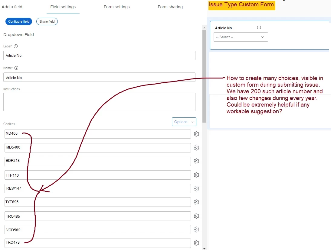 How to create many choices, visible in custom form during submitting issue. We have 200 such article number and also few changes during every year.