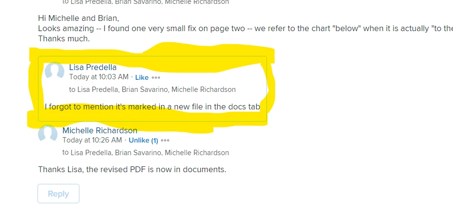 Attached is a screenshot of the blue box. The comment below is what no one can see in Notifications or email, unlike the other 26 in the thread.