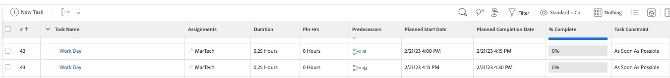 Hello! I am wondering if it is possible to have tasks auto complete if there is a role attached to it. I attached an example of the current task setup that I have. We do not want to assign the role as we use a project for a workaround to be able to track resources. Thanks in advance!