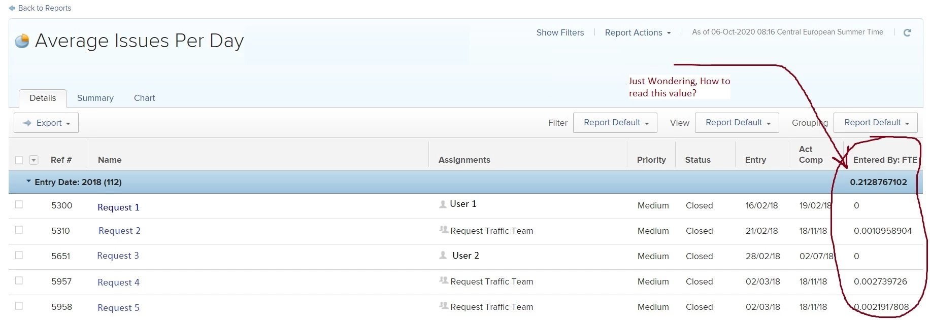Assuming that there are 365 days per year (usually), that each person who raises an Issue has an FTE of 1, and that it is the average per day within a particular year you are after (e.g. grouping your report by Entry Date, yearly), mathematically you can think of each Issue raised as being "worth" 1/365, from a SUM perspective (e.g. 365 Issues raised would be 365/365 = 1 per day, on average), in which case, you can effectively achieve the annual average you seek by doing a SUM using this textmode (in an Issue report view column):