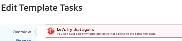 It is a huge inefficiency that we cannot bulk edit like items on template tasks in multiple templates. For example, I want to bulk edit a value on the same task custom form in multiple template tasks/across multiple templates. I pull all of the tasks in a template task report, select the several I want to change, all of which have the same task custom form, and you cannot do this. You get the error below. You can bulk edit tasks across projects, why can we not bulk edit tasks across multiple templates?