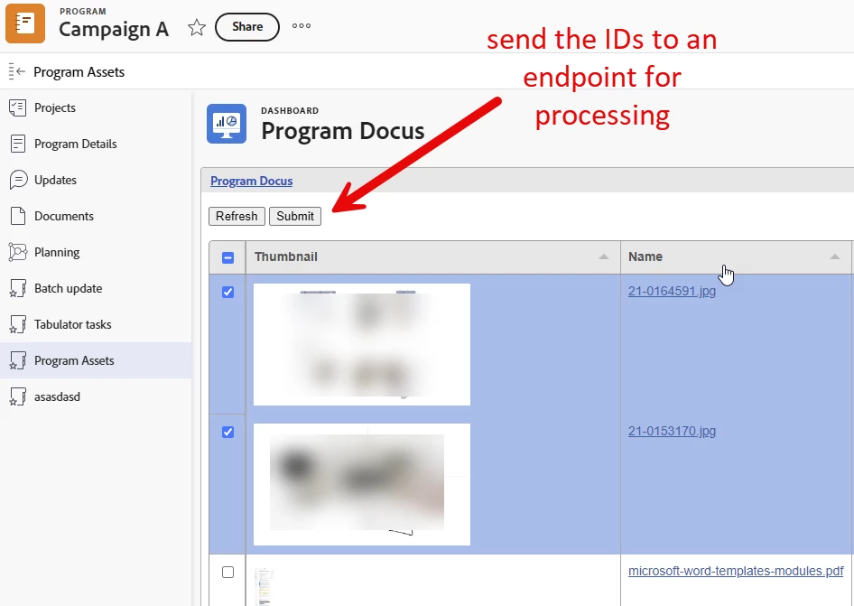 A custom dashboard for programs to list documents from all projects under this program. Adding a checkbox next to each item allows selection and posting e.g. the IDs to another scenario for processing. |