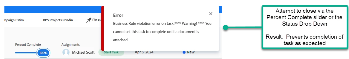 What works: When I attempt to complete a task using the Percent Complete slider to 100% or change the status drop down to "Complete", I receive the error as expected - fantastic!