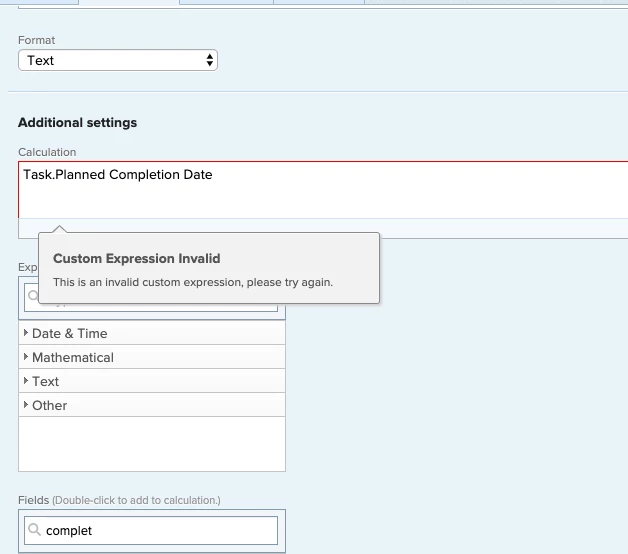 You might want to use "Source Task.Planned Completion Date". I usually find the fields by creating a report and seeing what I would use in that report space. So by pulling up an issue report and looking through the fields, I don't see a Task section but I do see a Source Task section. So that would be my first guess about what would work with the issue calculated field. By the way, I see your calculated field is set to text... you might want to set it to Date or Date/Time instead.