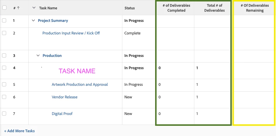 My goal is to report on the project status for the "# of remaining deliverables" {Yellow Square in Image}