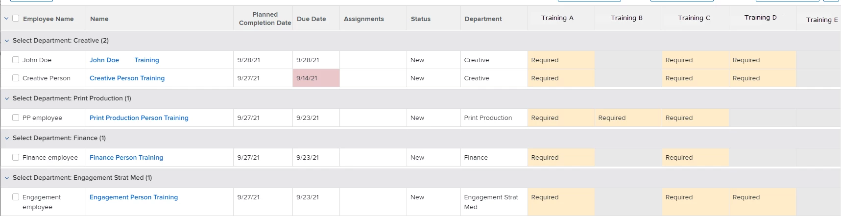 I then created a report that would show all of the possible trainings and added a display rule to change the color of the field if it was required. I set it to be gray if it was blank (indicating that training was not needed by this user), Green once it was marked complete. The only way I could get it to turn yellow of required was by adding the option of required in the form and making the requestor check required for all of the trainings that displayed for them. (Not ideal) I tried setting required as the default but that made all of the trainings (even the ones the display logic hid) on the report.