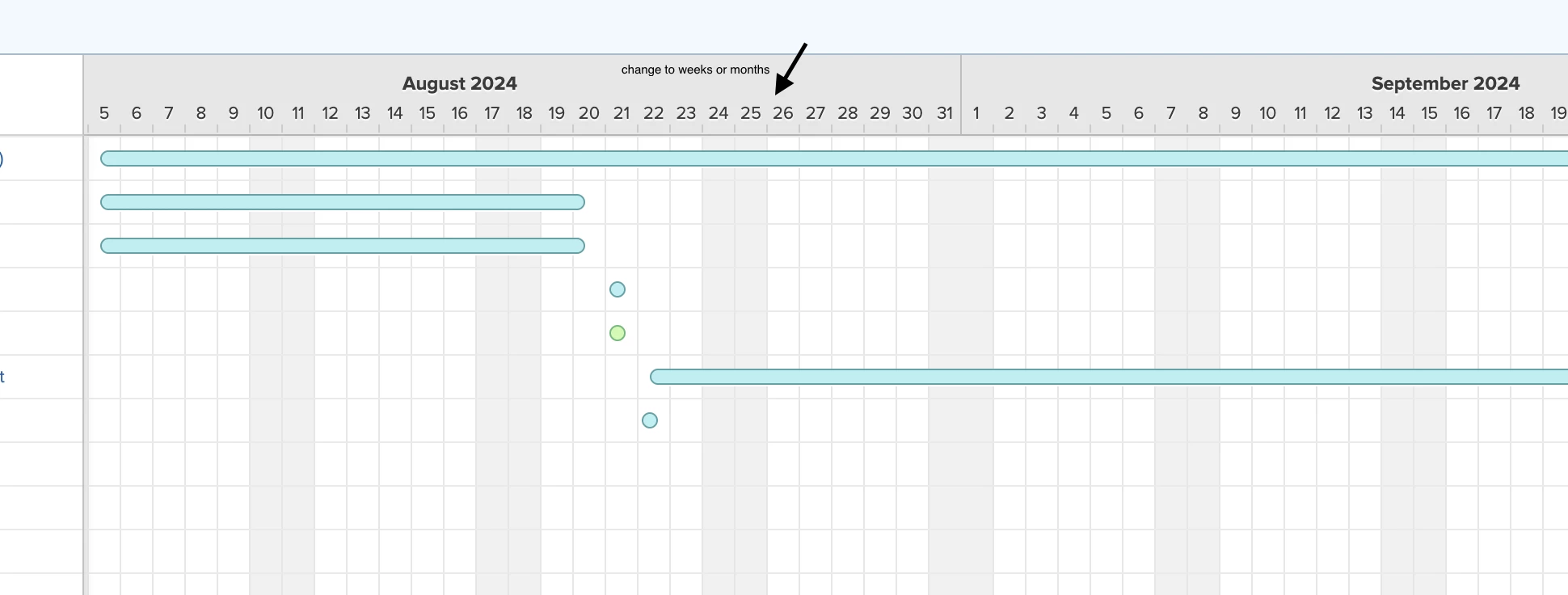I am creating a calendar report that spans several months. I want to be able to show the Gantt view in weeks but I don't have a way to change the ranges from a daily view. Is there a way to change the date range to months or weeks? Thanks!