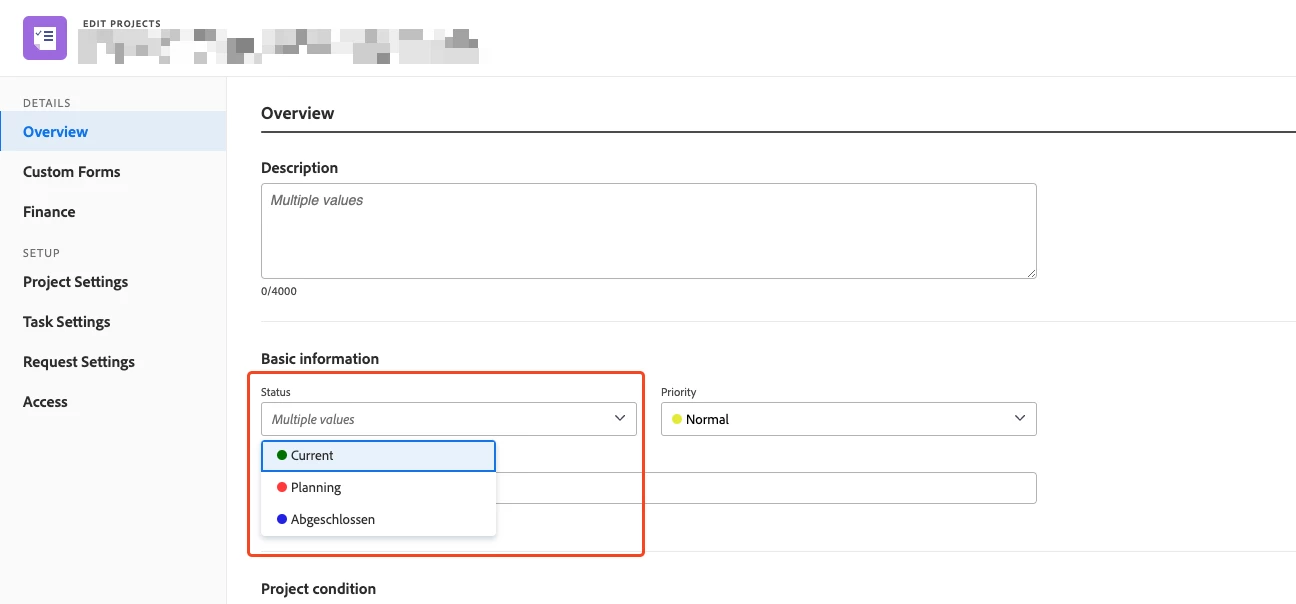 Create a project report that includes a project status column. I then click the checkbox to check all projects in the in progress state > edit in the top left corner > and within the project settings their is no option to change the project status. I can also confirm I'm a systems administrator.