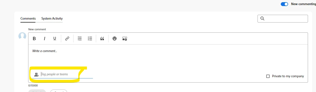 Once a request converts to a project, all people listed under the people tab would be auto tagged below, so someone does not have to manually tag the people who are already listed in the people tab.