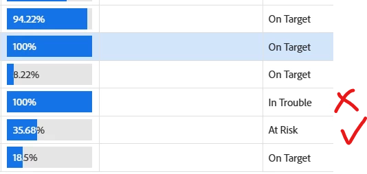 So, the one At Risk should be highlighted orange but the one In Trouble should not be highlighted red, as Percent Complete = 100.