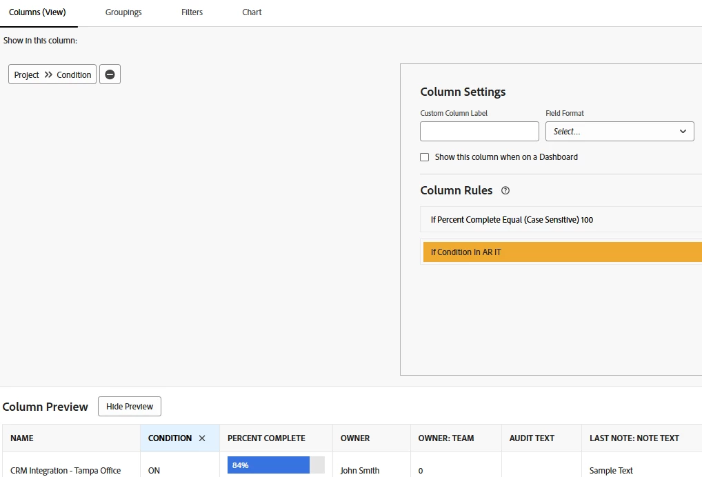 I've created a project report that highlights projects where the condition is 'At Risk' in orange or any that are 'In Trouble' in red. However, this should only be applied to incomplete projects (where Percent Complete < 100).