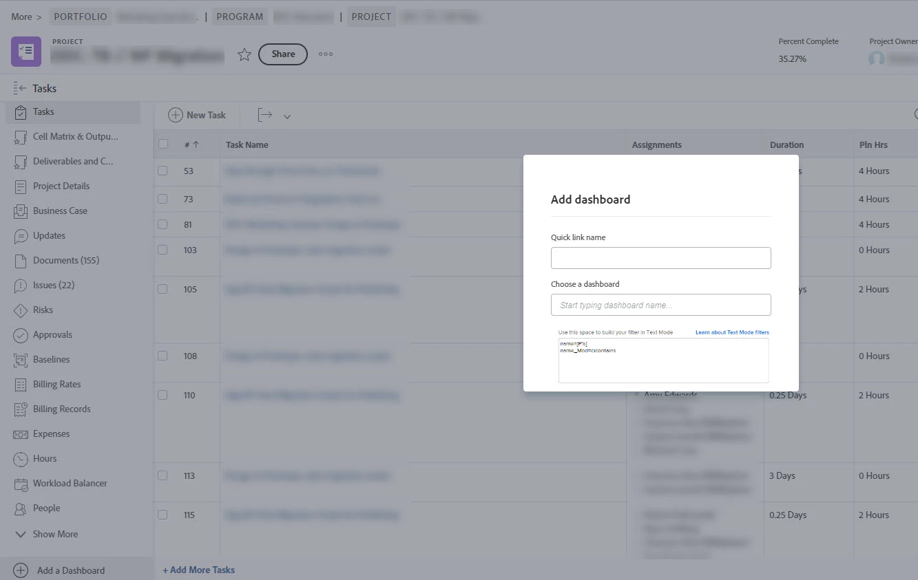 How would you like the feature to work - Add a Rules / Filter criteria, similar to defining Typeahead fields for when the dashboard displays. Thus if I add a Dashboard to a Project on either the Layout Template or personally, allow it to only show for Projects that meet specific criteria, maybe the Portfolio is a specific one, or there is a custom field on the Project that it looks at and determines whether to display the dashboard