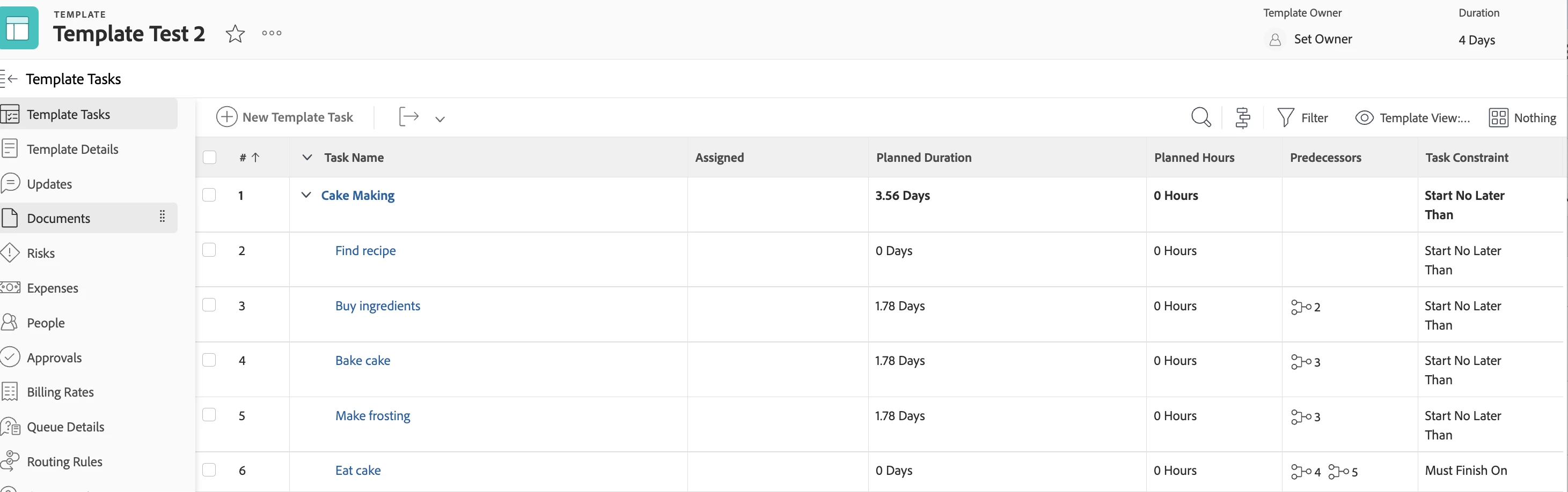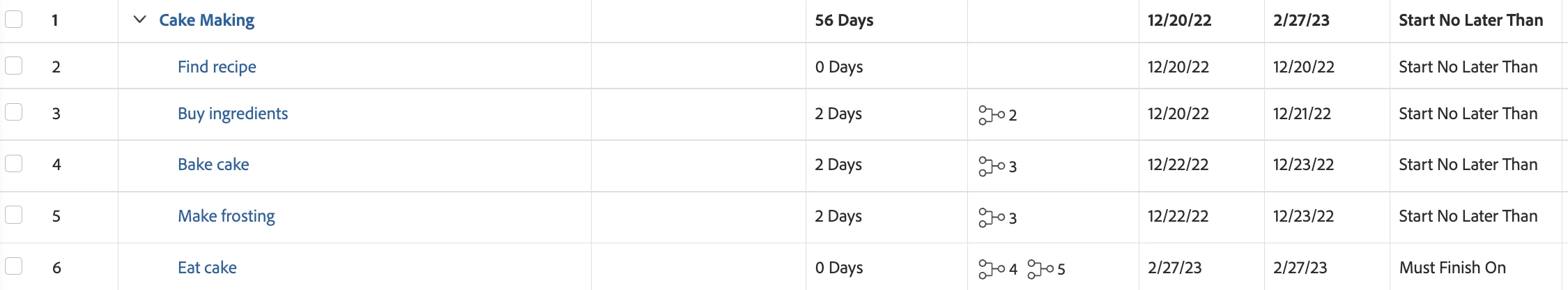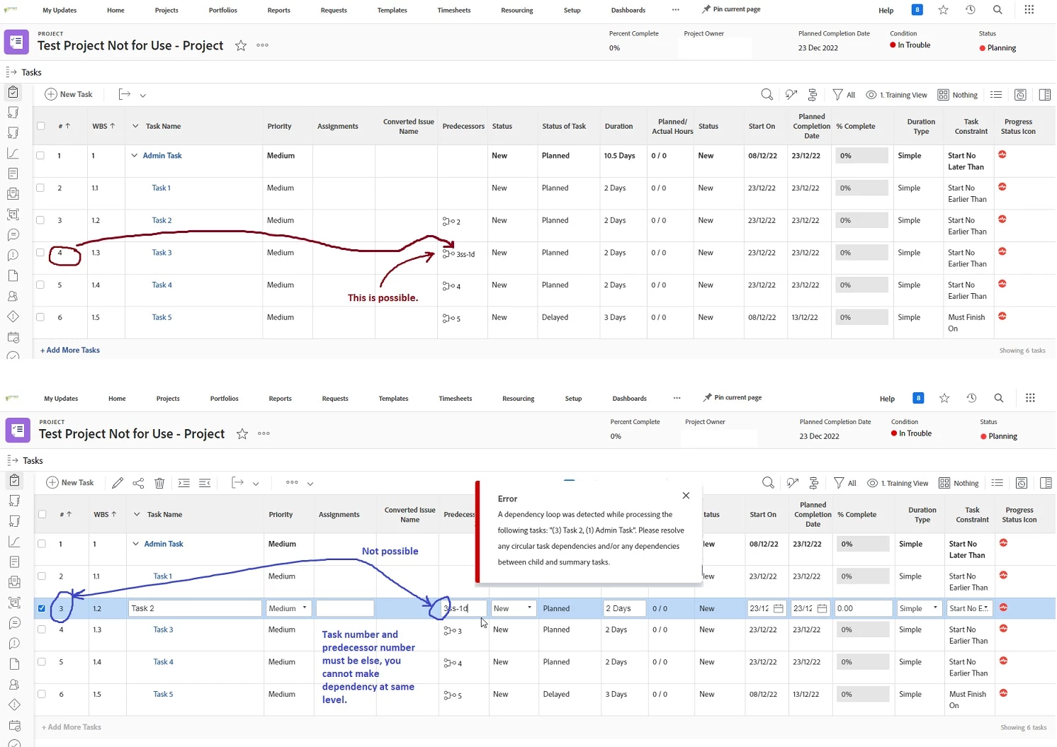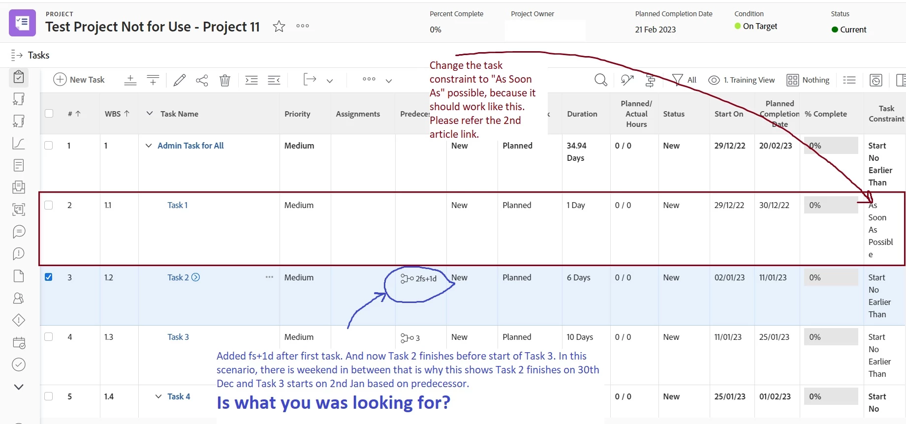 Then I created a project from this template. The due date of the final task and planned completion date of the project autoset to today's date. I changed the planned completion date to a later date, and then changed the due date of the final task, but none of the preceding tasks dates changed. In addition, the due date of the first task (Task 2) is the same day as the start day of the second task (Task 3). I tried adding a predecessor of "3ss-1d" to Task 2 but I got a dependency loop error. What am I doing wrong? 😫
