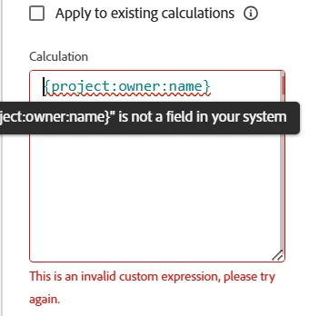 I'm trying to pull the project owner name into a custom field on a form. Owner name is not an option in the fields, but ownerID is. I was able to use syntax for the name and it shows it in the calculation result (see image) but gives an error and won't let me save the expression.