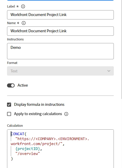 I am using a calculated field to provide a clickable, concatenated Workfront Document Project Link that users can click when it is attached to a document. Currently, the URL’s environment is hard-coded as “my”. I know that $HOST is available for External Lookup fields and can retrieve the environment dynamically, but I’m looking for a way to both build the URL and retrieve the environment value dynamically.