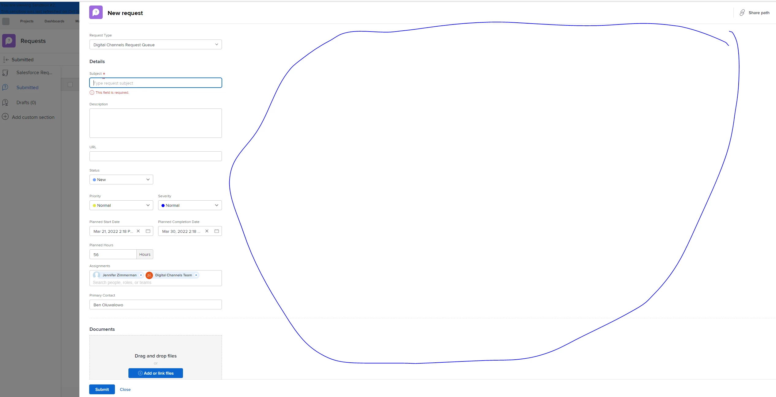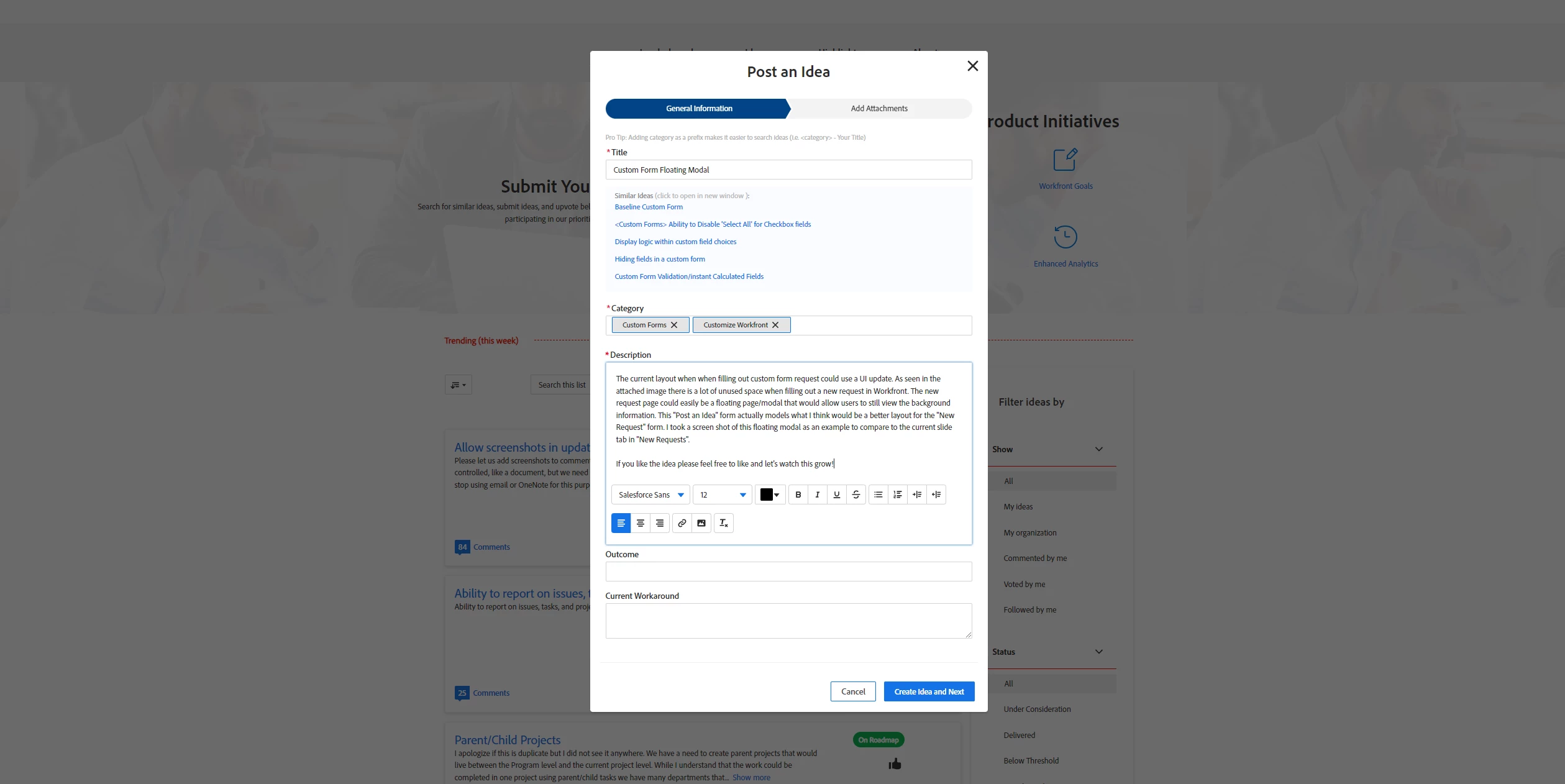 The current layout when when filling out custom form request could use a UI update. As seen in the attached image there is a lot of unused space when filling out a new request in Workfront. The new request page could easily be a floating page/modal that would allow users to still view the background information. This "Post an Idea" form actually models what I think would be a better layout for the "New Request" form. I took a screen shot of this floating modal as an example to compare to the current slide tab in "New Requests".