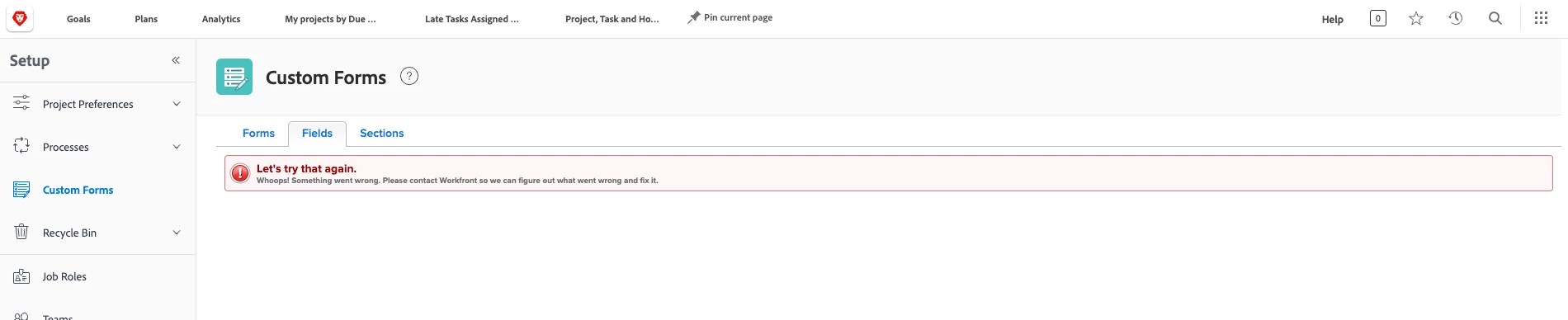 If multiple system admins are present in your instance, verify if they are experiencing the same error. If so, submit a Workfront ticket. Otherwise, attempt to resolve the issue by clearing your browsing data (cookies, cached images and files).