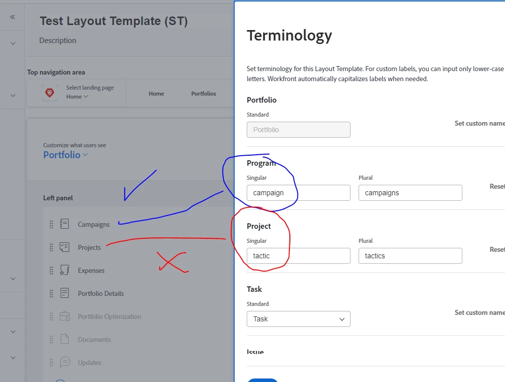 I changed the custom terminology for Projects to Tactics. However, the new terminology isn't being reflected in the system fully.
