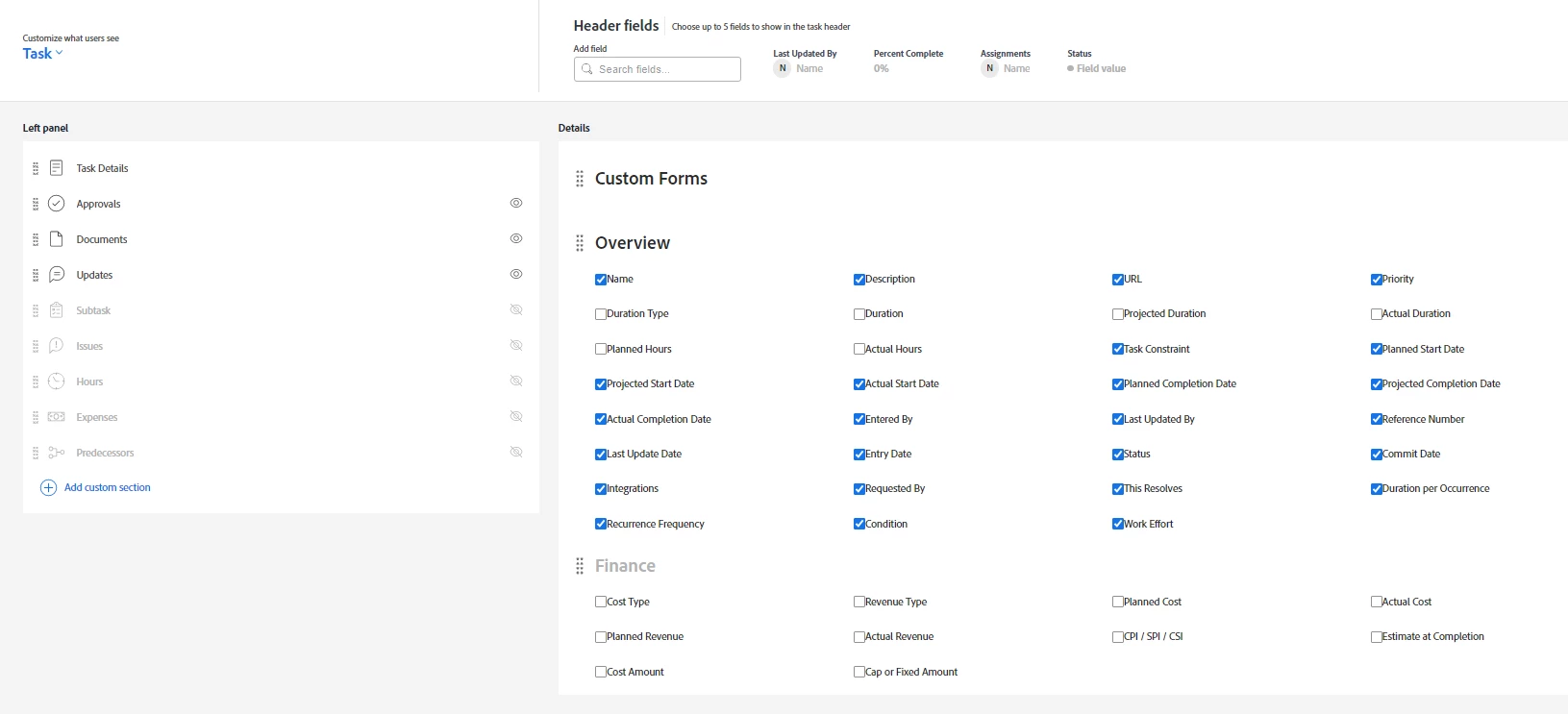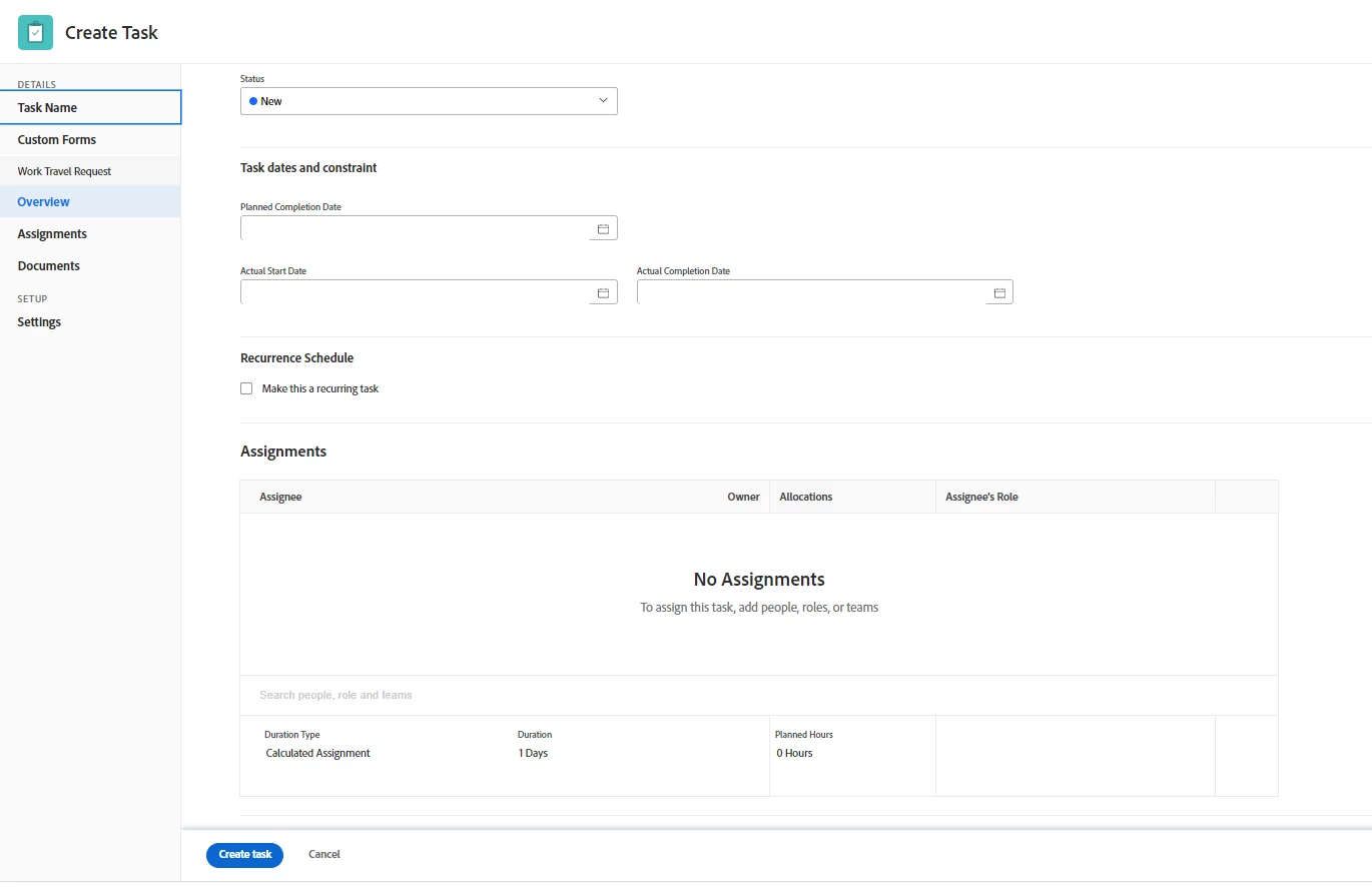 I am wanting to customize what my team sees in the task creation menus. I am able to attach a custom form, but I want to hide sections such as Task Dates and Constraints, Assignments, etc. as seen in the image below. My team does not use all of these options, so I want to "de-clutter" the screen for them. This seems like an issue that would be solvable in Layout Templates, but I cannot find where to customize these specific options. The Layout Template for Tasks only allows me to customize the Task Details once the Task is already created. If this is possible, please let me know. Any help would be appreciated! Thanks!