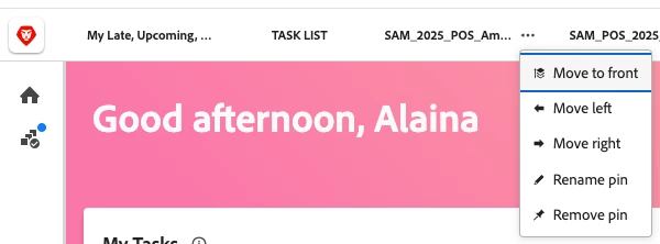 I noticed an update to Workfront's interface recently. When you pin projects to the top tool bar, you used to be able to drag and drop to rearrange their order. Now you have to right click and say "move left" or "move right"