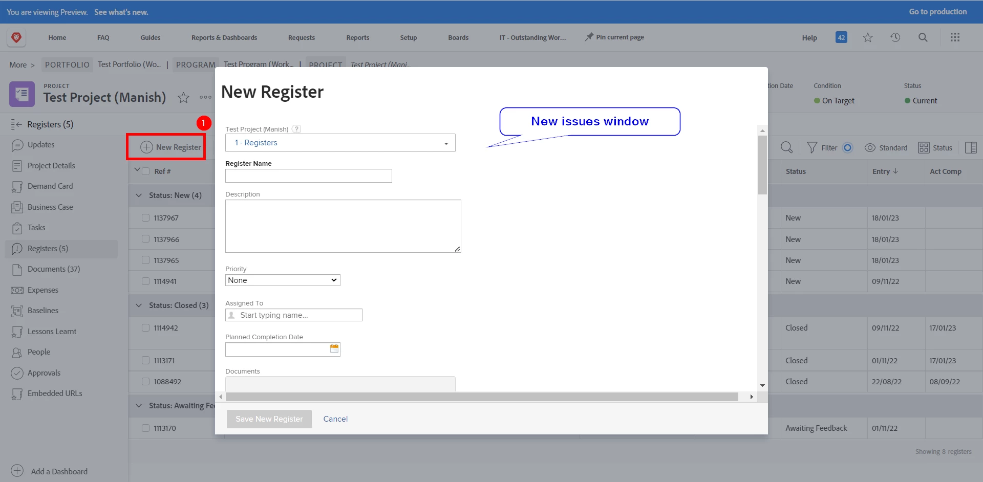 New Issue Window: