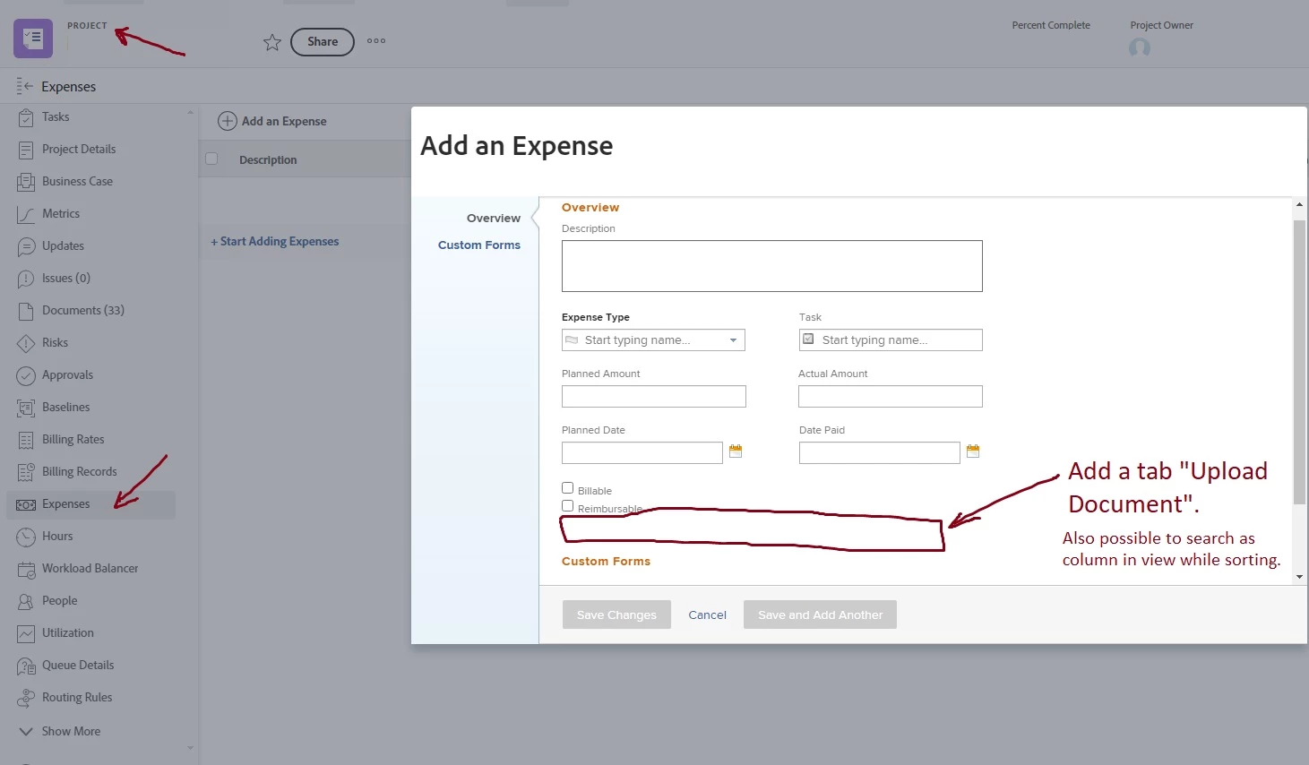 Description - Enhancement to attach document with Expense (image, pdf and others) from local drive in project.