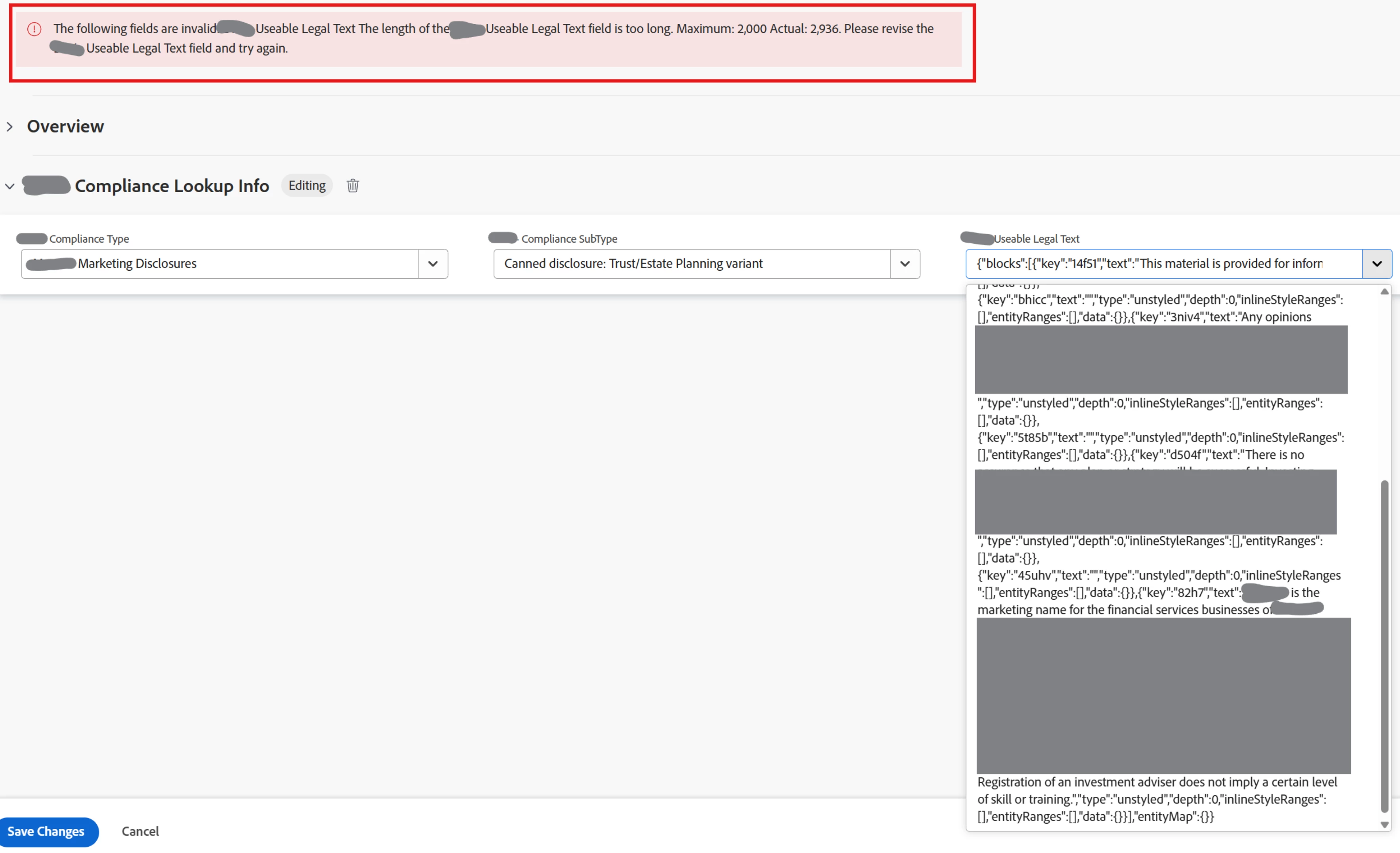 2. Manipulating a field with a dependency can cause an error result on an otherwise valid choice, creating hidden "invalid" choice amongst valid choices all driven by character limits. This is difficult to control because the JSON wrapper is variable as well, so text block of 1,800 characters could be valid in some cases and invalid in others solely based on how many paragraphs were used in the text.