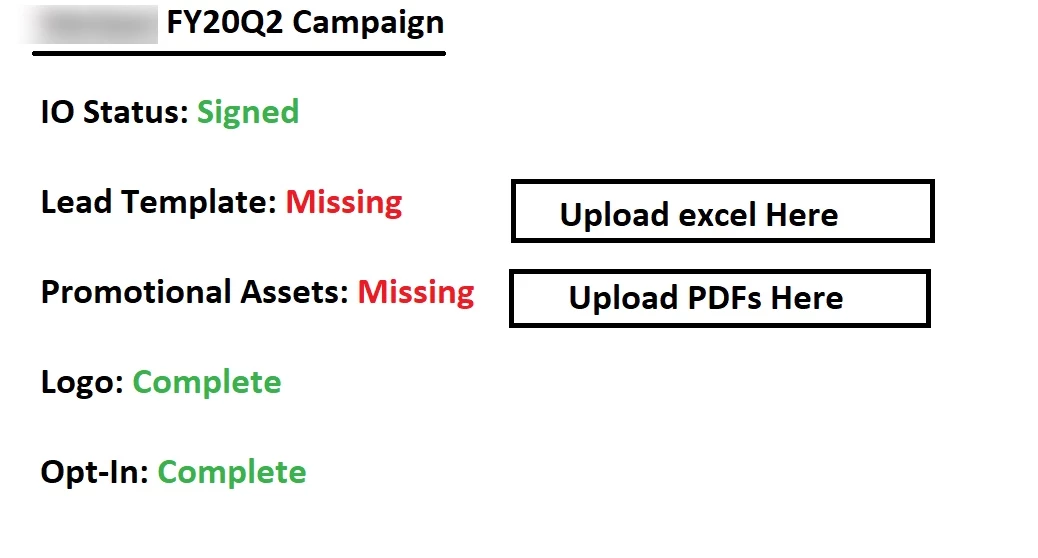 Our professional services department is looking to have 1 location where we can have a set of fields that our team needs in order to begin the services. Ideally, we would like to share this list with the customer so that they have a "portal" to upload the missing documents into. I know that you can add customers as "External" users and request documents from them but ideally we would love to have this "portal" that clearly lays outs all needed materials for a campaign to launch. The client can have access and upload as they have materials ready, and then once ALL materials are in, our internal team would get a notification or task that the campaign has all materials in and is ready to build. I uploaded a screenshot to get an idea of what we are trying to do.