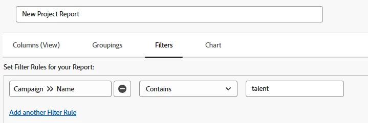 Right now I have a report filtered by program name (ID) where I typed in the word "talent" and just selected all of the programs with the word talent in the name. However, this doesn't automatically update because every time a new program with the word "talent" get's entered, I would have to go back in and add it it the filter. I'm assuming the best way to go about this is to add a text filter that filters every program with the word "talent".