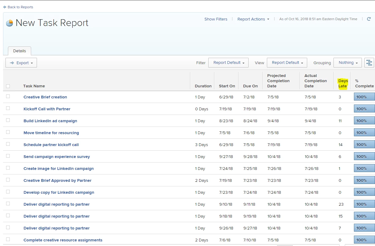 I'm trying to filter out tasks where the days late value is 0, but the report throws an error when I use the code below. Any ideas? daysLate=0 daysLate_Mod=lt Catherine Hayes The Channel Company