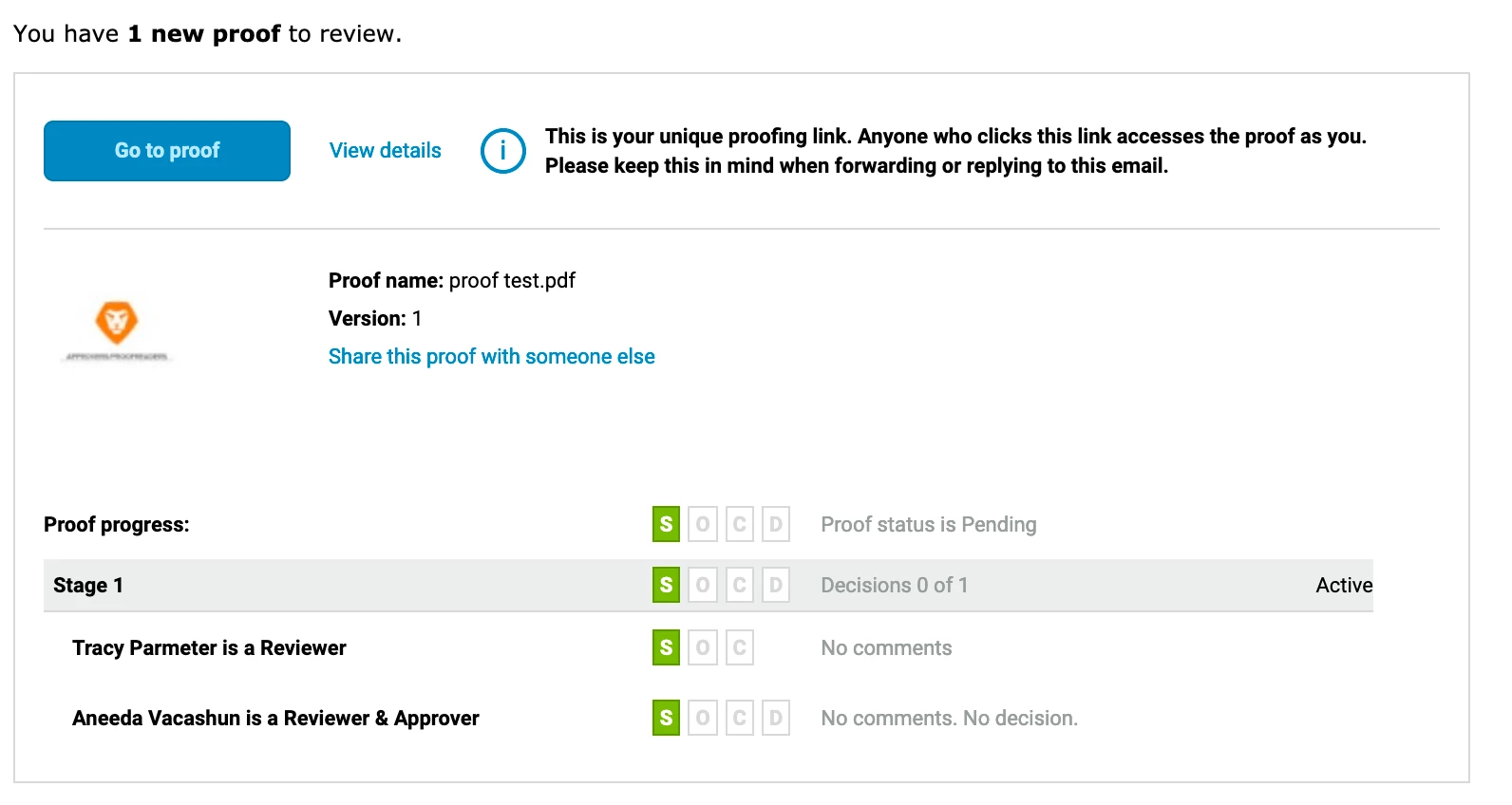 The issues we run into is when that third party receives the proof, when they try to open it an email is sent to the proof owner -- which is typically a designer or web content author for us, unless the project manager has set themselves as the owner when they sent out the proof, some remember to do this, some don't.