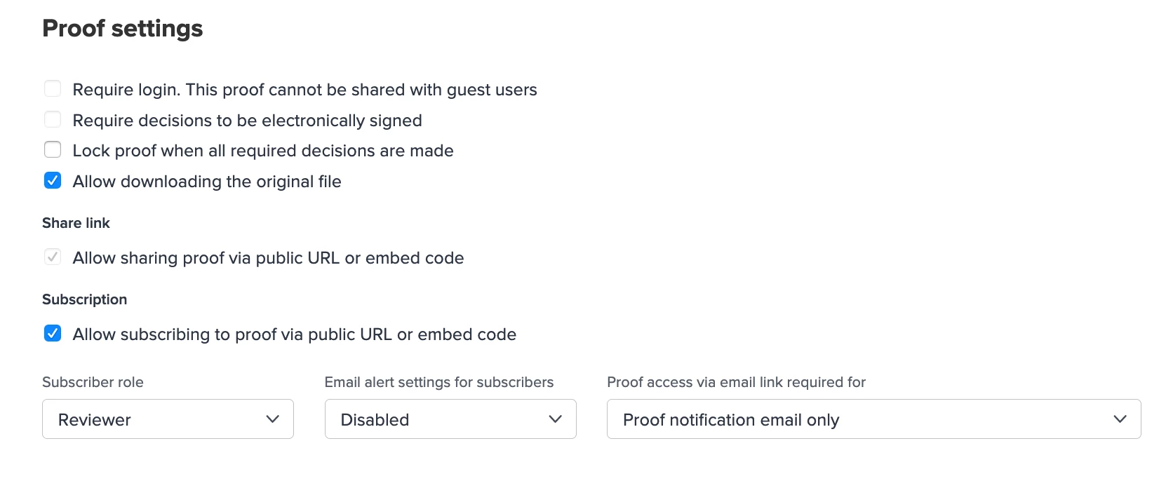 But "Require Login," "Require decisions to be electronically signed," and "Allow subscribing to proof via public URL or embed code" are all unchecked for us.