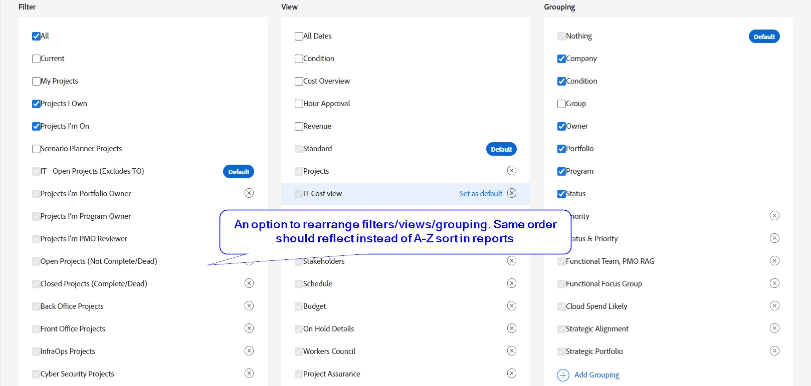 Description - Currently, the filter/view/grouping cannot be rearranged, and they show in an alphabetical order in reports or for example in project view from main menu.
