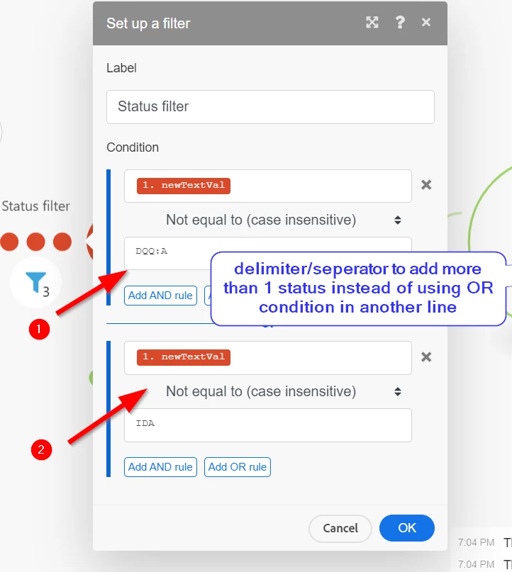 How do I separate/delimit multiple project status within a single line without relying on the use of an OR condition? Currently, I'm using OR condition (1 status in each section), but the ask is to mention them in same line using a delimiter. Is this possible? I have tried comma and pipe. Thanks!