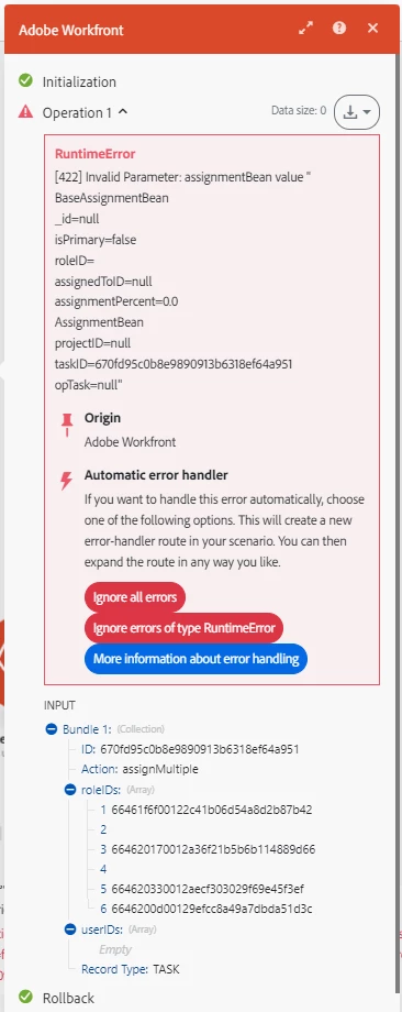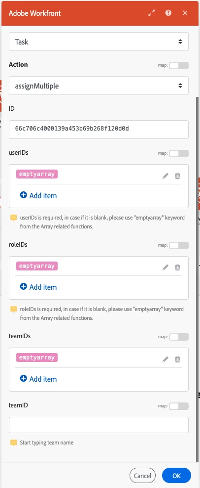 Initially, I tried setting the result to null when a role wasn't needed, but that generated an error. To work around it, I've been assigning a default role—specifically the project manager role, since they are always assigned to tasks. However, this results in the project manager being assigned multiple times when fewer roles are selected. For example, if two out of five fields are selected, the project manager role ends up appearing three extra times in the task.