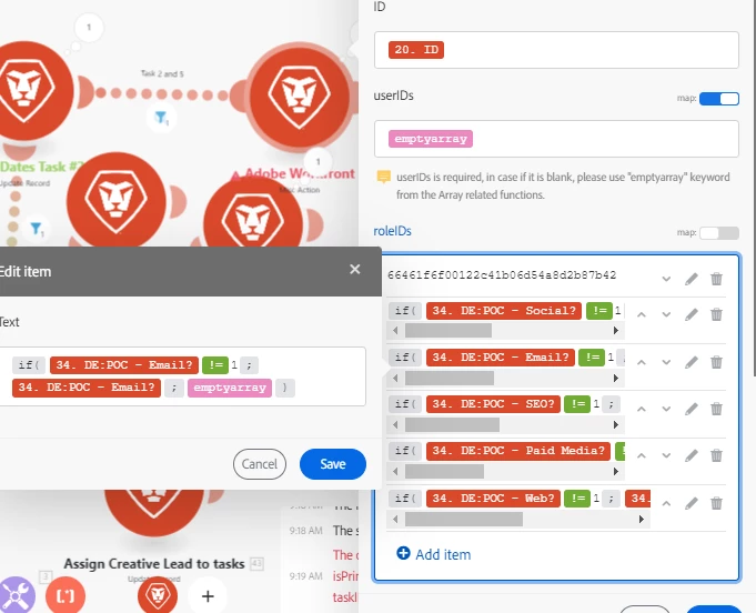 I'm using Fusion and working on a setup where I want to assign specific roles to a task based on selections in multiple fields. The best method I've found so far is using the Misc Action module with logic strings for each role. When a field indicates a role is needed, I assign the corresponding Role ID. However, when a field is not selected, I encounter an issue.