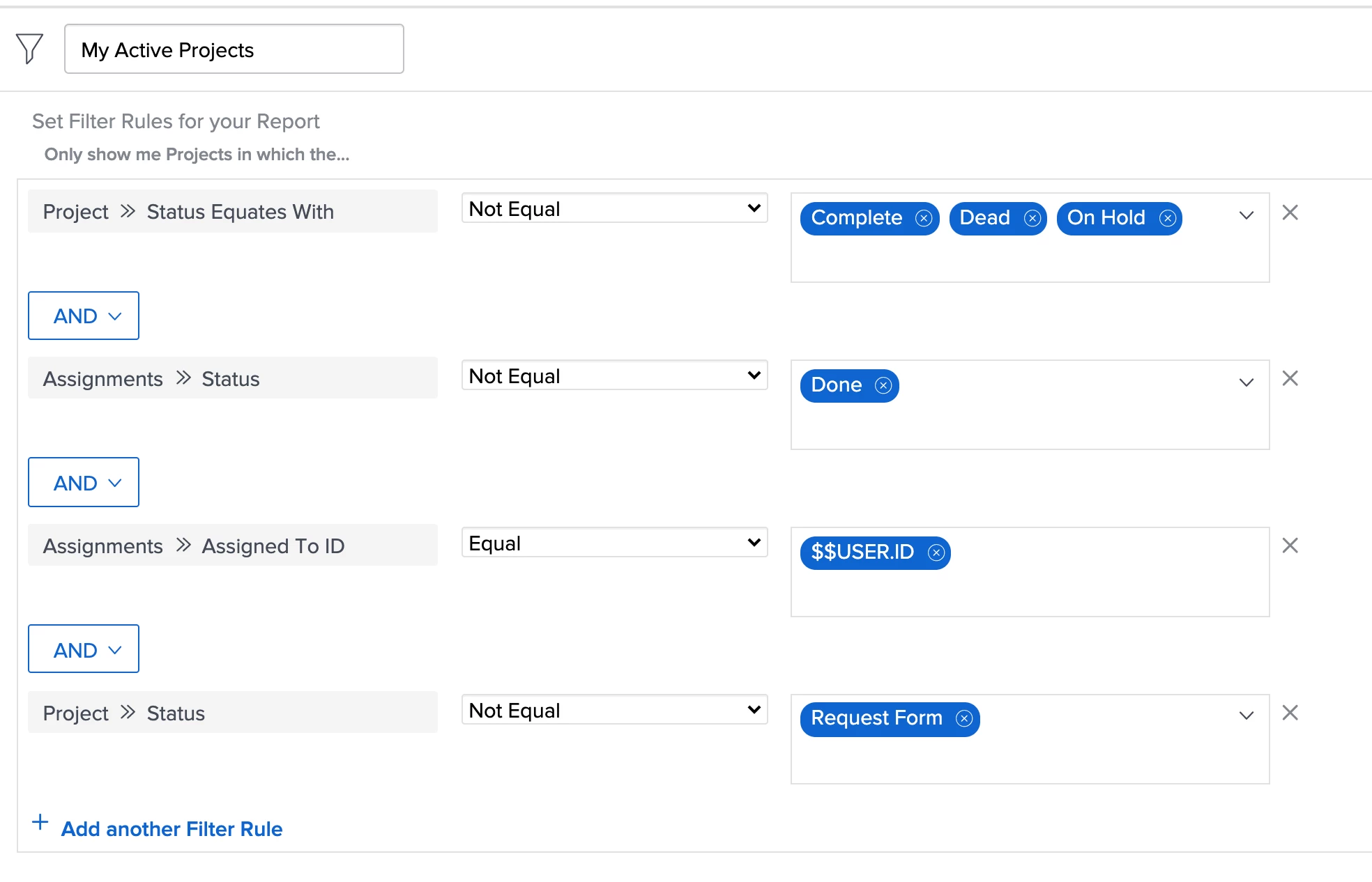 I've attached how I have the filter set up. I want the filter to be so that any incomplete task assigned to the logged-in user shows up in the main project list. The way I have it set now, projects still appear even though the logged-in user task may be complete for those projects. Because other tasks assigned to other users are still open, it appears. What am I missing?