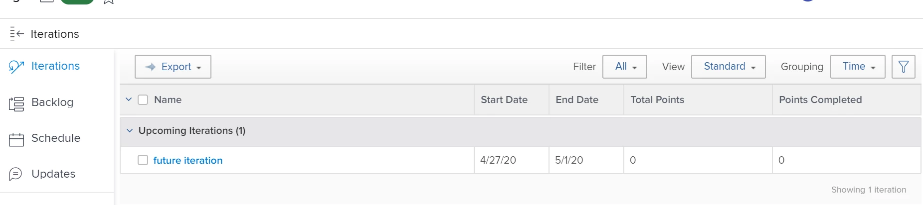 I created a new iteration that starts next week, but I was unable to access it once it was created. I finally gave up and switched back to the Classic Experience so that I could review it.