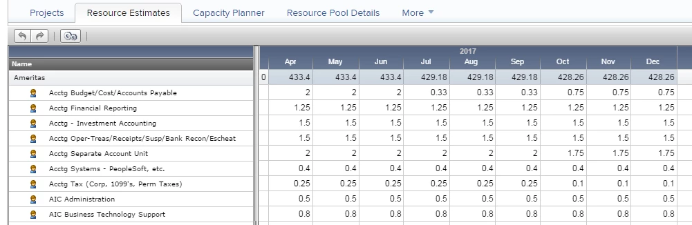 That's one reason we have partial capacity at the role level. Also, we may have 50 people all capable of participating in a project (think non-IT staff), but only a few, maybe 5 FTE equivalent can be assigned. We don't know what combination of specific people will constitute the 5 FTE, so there is not much value for us to assign specific FTE values to all users.