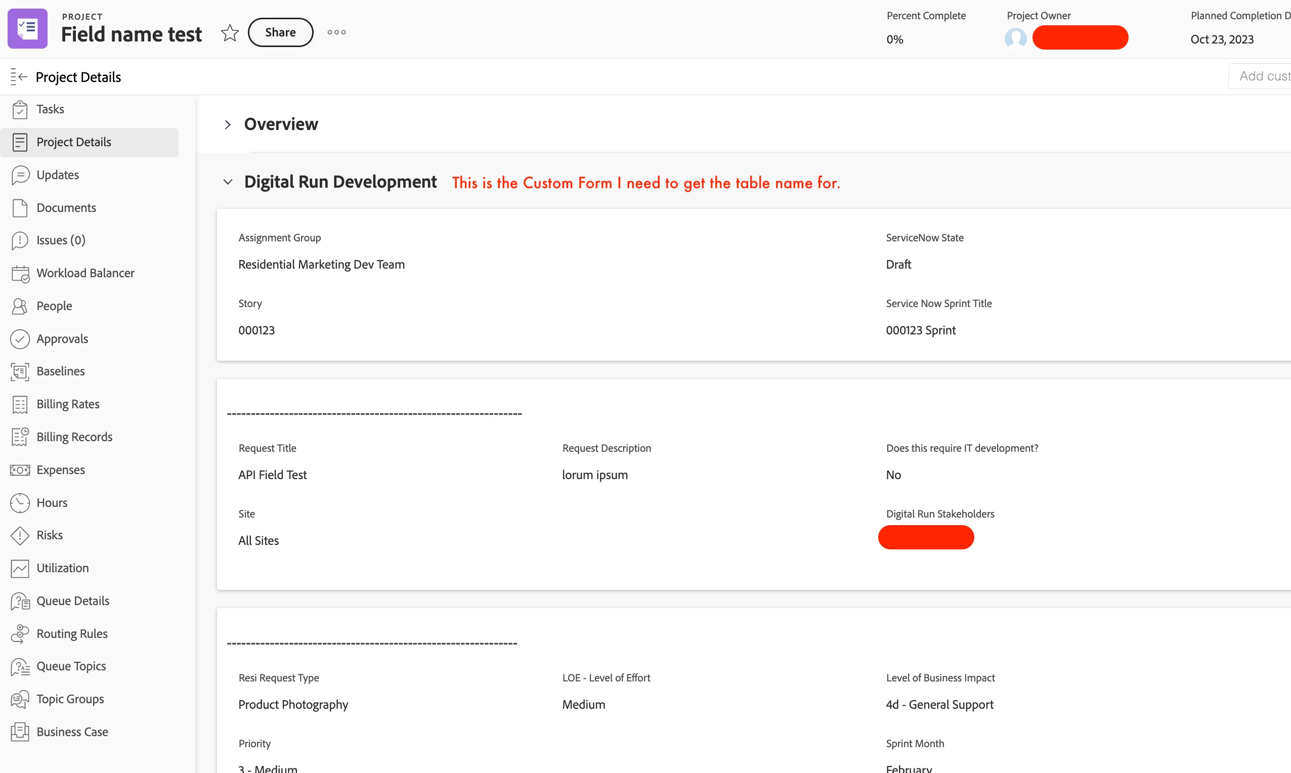 To make it a bit clearer to understand, we have a request queue that is utilized at an enterprise level for a majority of projects. When we convert the request to a project, a custom form called Digital Run Development can be added with a specific template. So, once converted there are three sections on the Details section: Overview, Digital Run Development, and the enterprise custom form. I need to see the table name for the Digital Run Development. Because when I make a field name request for the custom fields, all I can see is the name and ID of the test project I created and I don't see anything that indicates the Digital Run Development custom form.