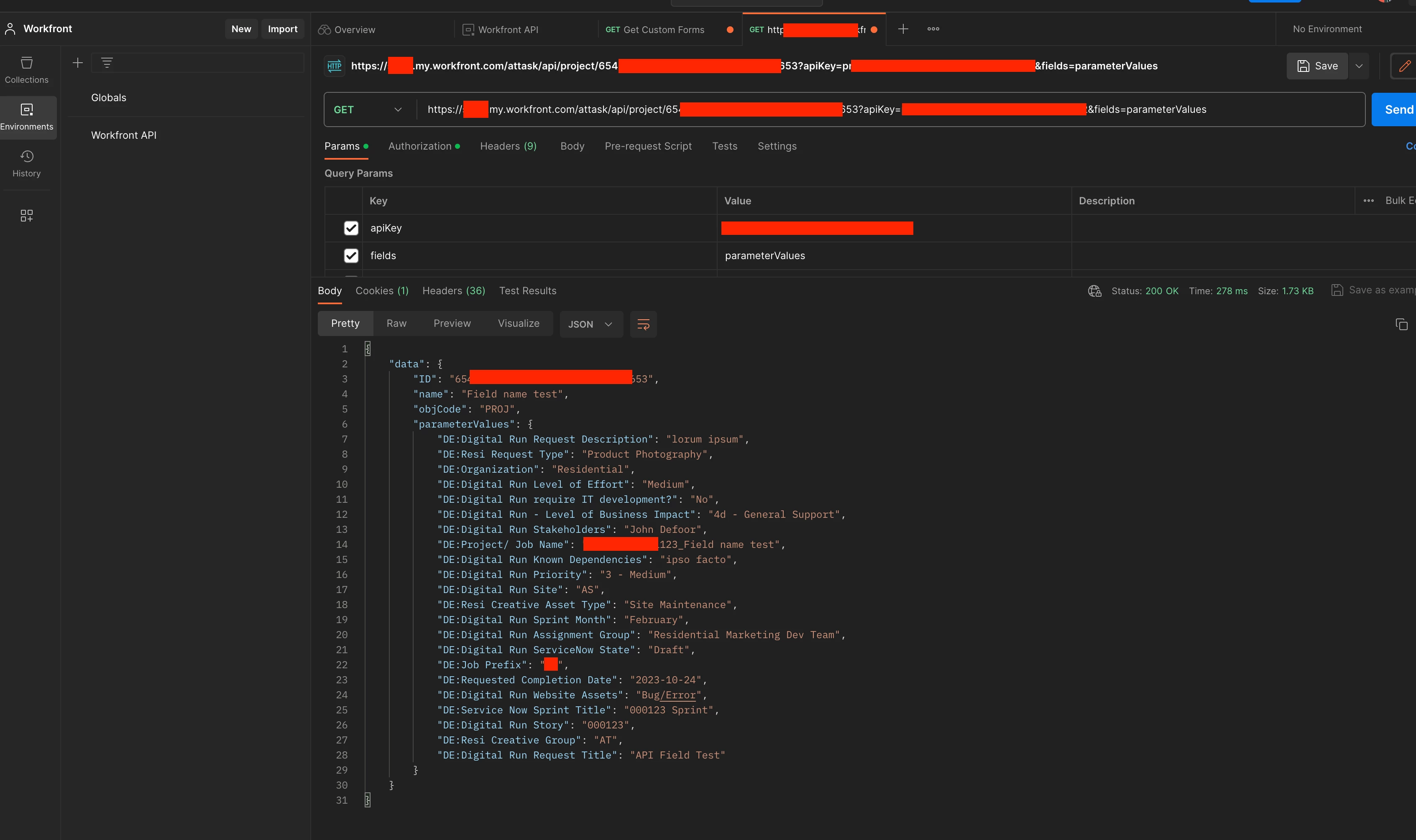 This is what I see when I look for this particular test project through Postman. The custom fields show, but I don't see a reference to the above custom form: