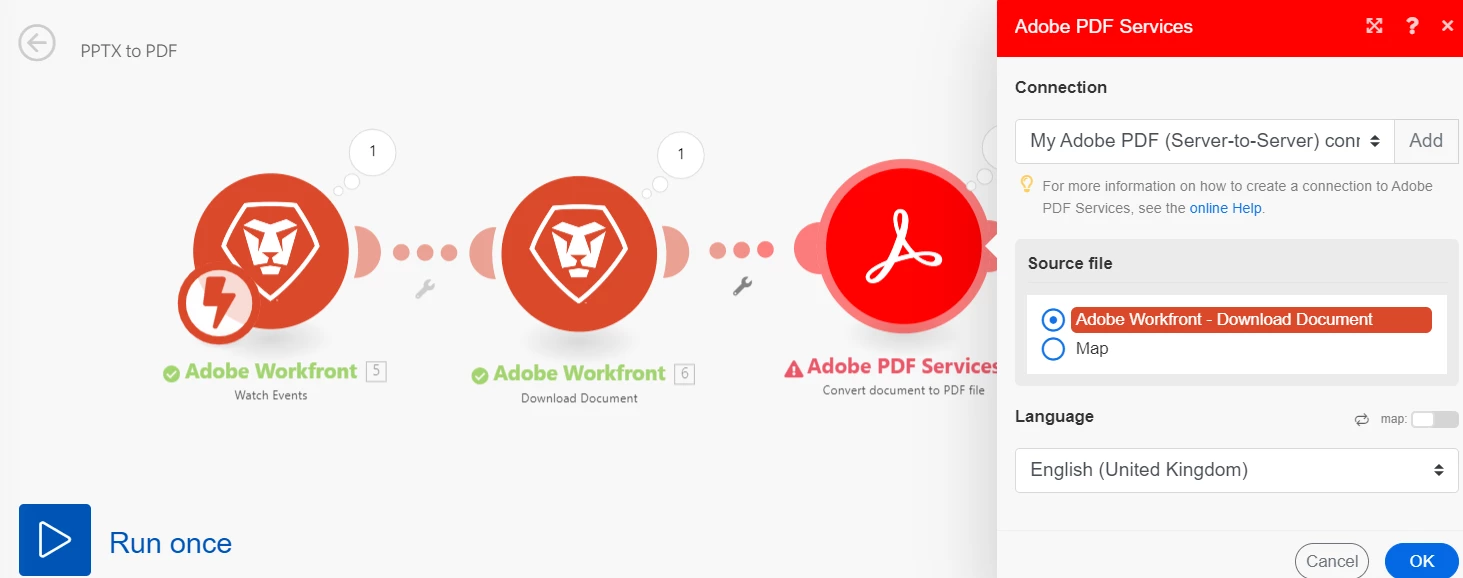 I think there is a bug in the Fusion module, as it does use the wrong media type when uploading the file to Adobe PDF Services.